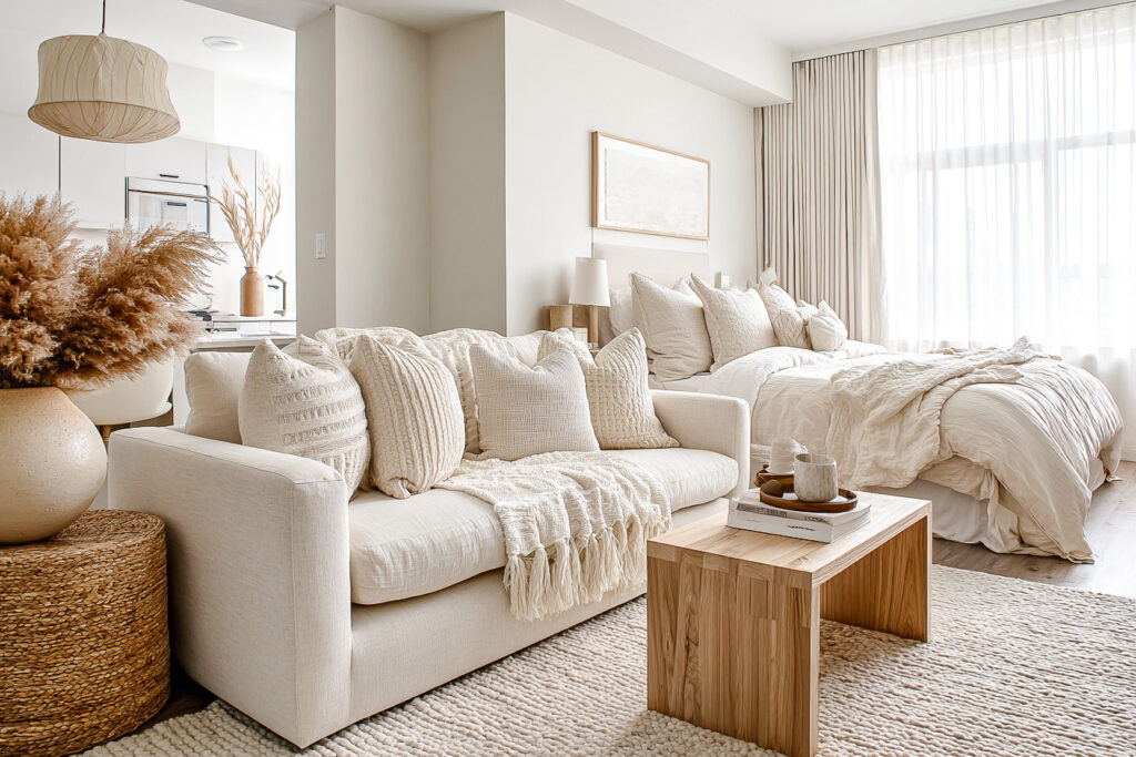 A warm neutral base helps the blue accents feel intentional instead of overwhelming. It also makes the whole space feel a little more expensive.