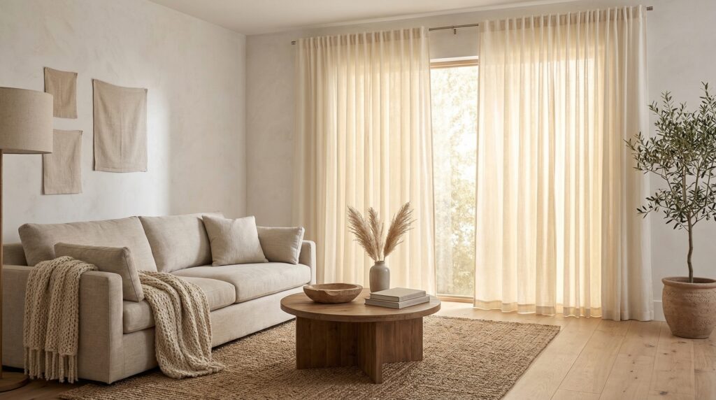 Curtains matter just as much. For that designer look, hang them high and wide. Put the rod closer to the ceiling, not directly on top of the window frame, and make sure the panels are long enough to almost touch the floor. Linen or linen-look curtains are especially good in neutral spaces because they soften the light and make the room feel more relaxed.