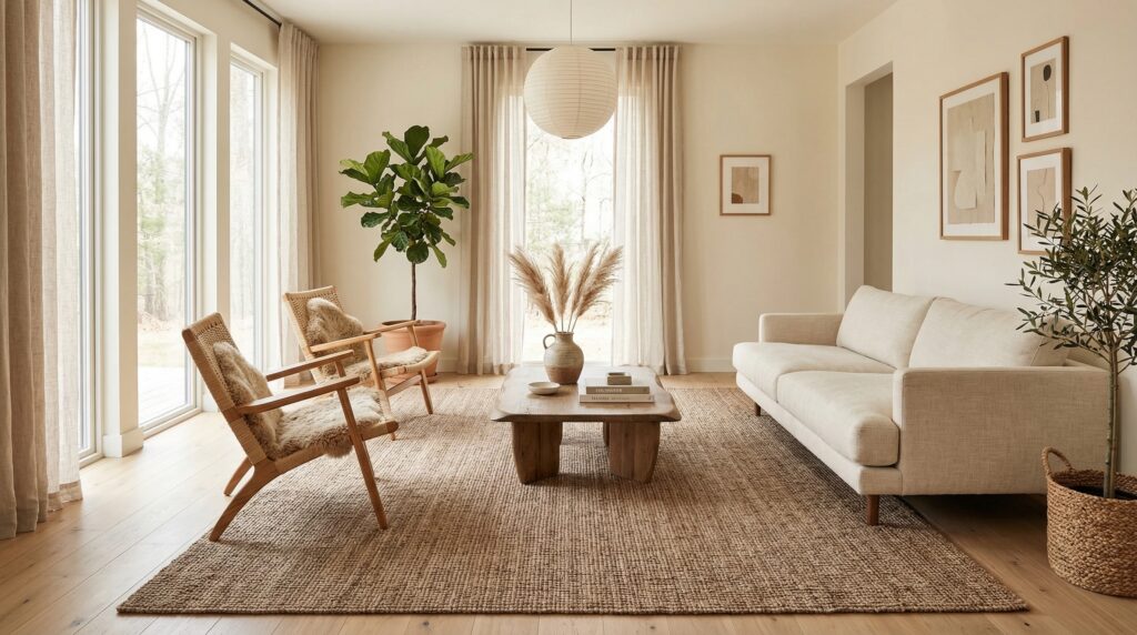 In a neutral living room, rugs also add essential texture. Jute, flatweave, wool-look, and other tactile materials help the space feel grounded. Even if the color is quiet, the texture keeps the room from looking bland.