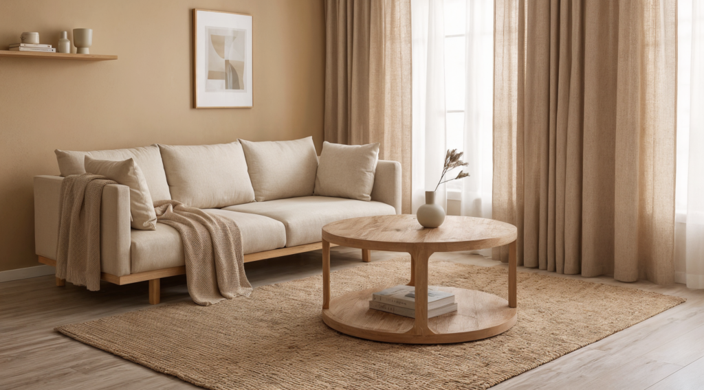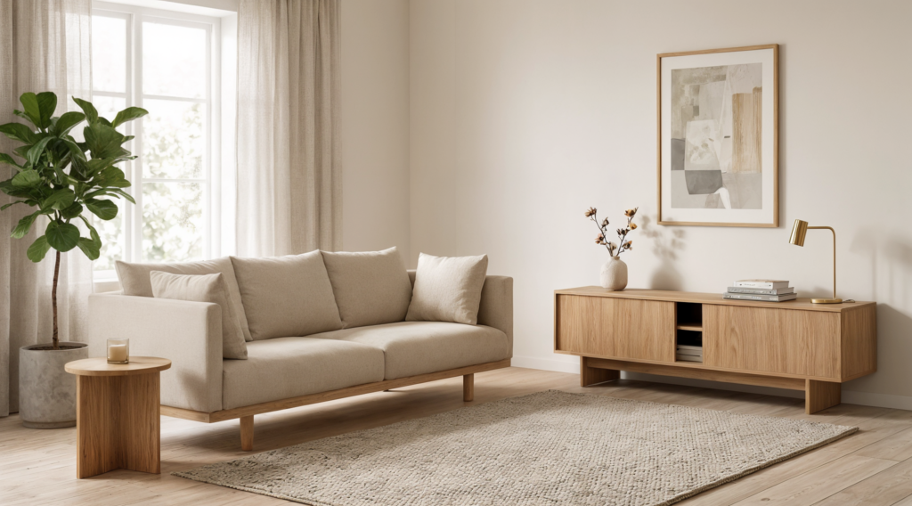 A simple formula works well: use one light base, one warm wood tone, and one slightly deeper accent. That could mean off-white walls, a natural oak coffee table, and a darker brown pillow or frame. When everything is the exact same tone, the room can feel washed out. When the tones are close but not identical, the room feels layered and elevated.