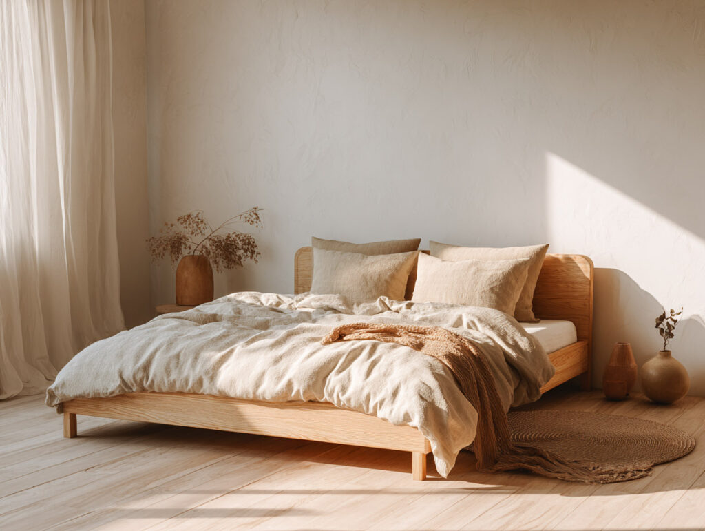 Wood beds also benefit from soft contrast. If the frame is clean and minimal, the bedding should do more of the cozy work.